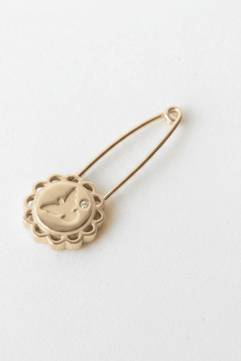 A medalha possui 12 mm de diâmetro, com desenho delicado e borda trabalhada, enquanto o alfinete tem 29 mm de comprimento total, garantindo leveza, segurança e conforto para o uso infantil.