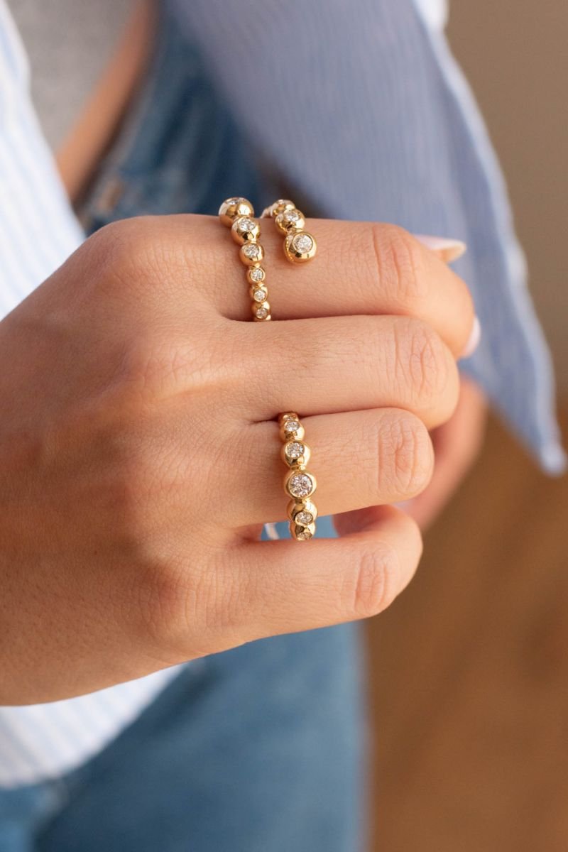 Anel aberto em ouro 18k, com design delicado e contemporâneo, adornado por diamantes naturais que somam 0,50 quilate. As pedras são cravadas individualmente em molduras circulares, criando um jogo de brilho elegante nas duas extremidades do aro.