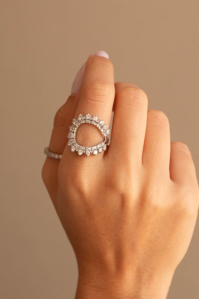 Sua estrutura vazada é contornada por diamantes cuidadosamente cravados, totalizando 1,17ct, criando um efeito de brilho intenso, elegante e com presença.