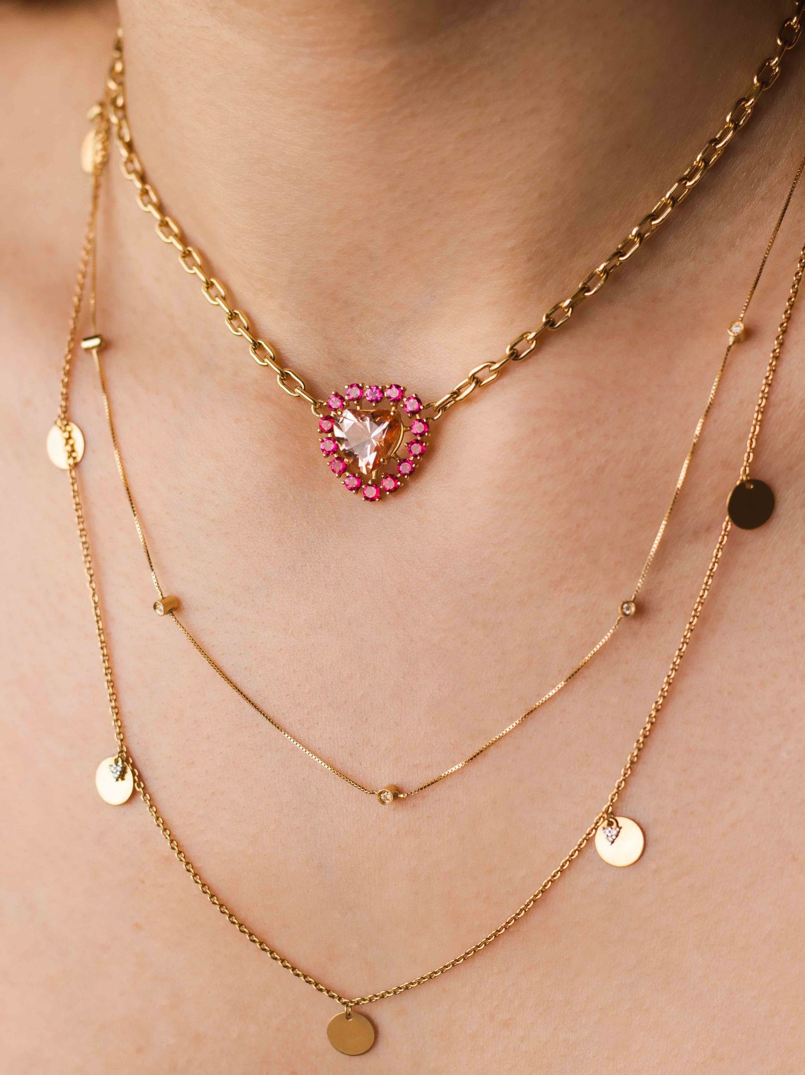 Colar ajustável corrente elos em ouro 18k com coração em Topázio Peach e Topázios Pink cravejados em torno 1,15cm x 1,1cm | Corrente 45cm com ajuste até 36cm
