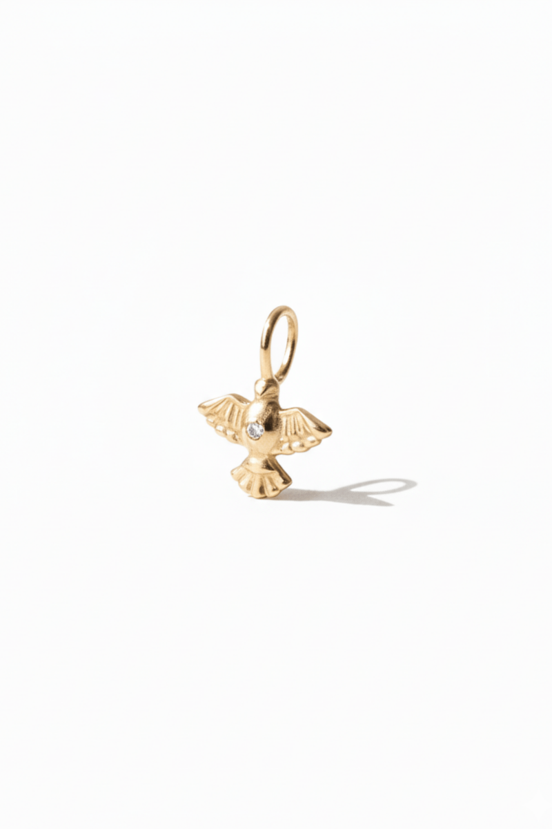 Delicado e atemporal, este pingente em ouro 18k apresenta o Espírito Santo em um desenho sutilmente trabalhado, com volumes suaves e acabamento polido que valorizam cada detalhe da peça.