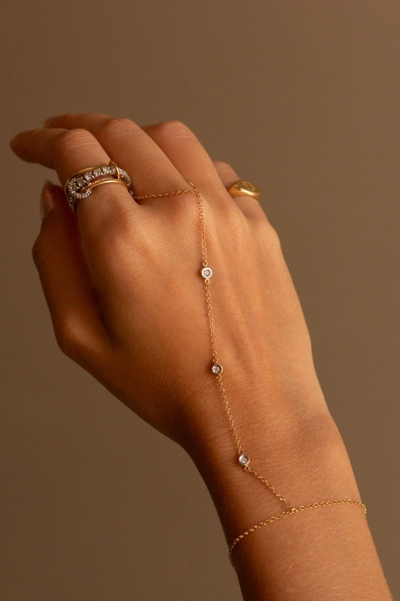 Delicada e sofisticada, esta pulseira de mão em ouro 18k se conecta ao dedo através de uma corrente resistente e elegante, criando um efeito único sobre a pele. O design é valorizado por três diamantes lapidação brilhante de 0,15ct cada (totalizando 0,45ct), cravados em moldura lisa que realça o brilho natural das pedras. Tamanho único. Possui extensor.